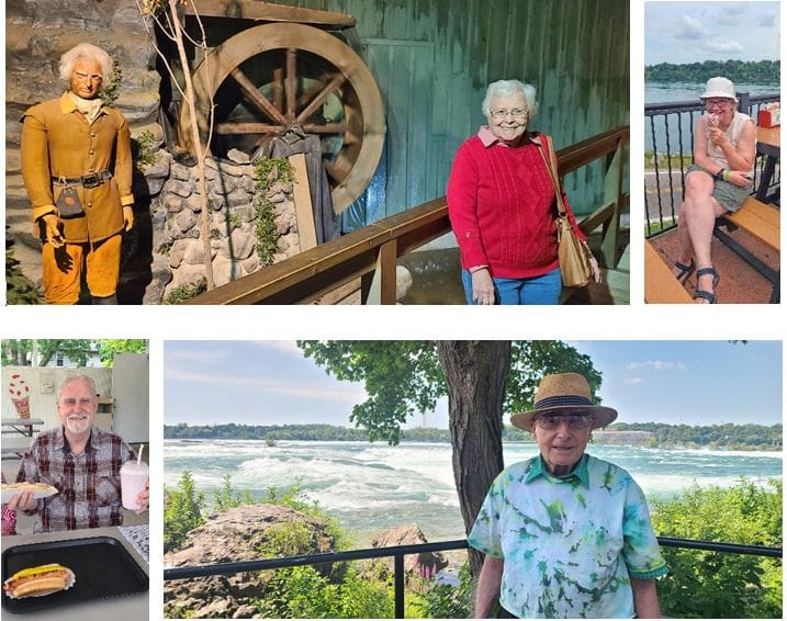 Pictured clockwise above are residents Betty Duane at the Niagara Wax Museum in Niagara Falls; Ruth Helfinstine enjoys a sweet treat during a lunch outing to The Silo Restaurant in Lewiston; Wilbur Treichler enjoys sightseeing at Three Sisters Island in Niagara Falls, and Doug Godwin gets ready to savor the flavors of summer with hot dogs and milkshakes at Sullivan’s Hot Dogs and Ice Cream.
