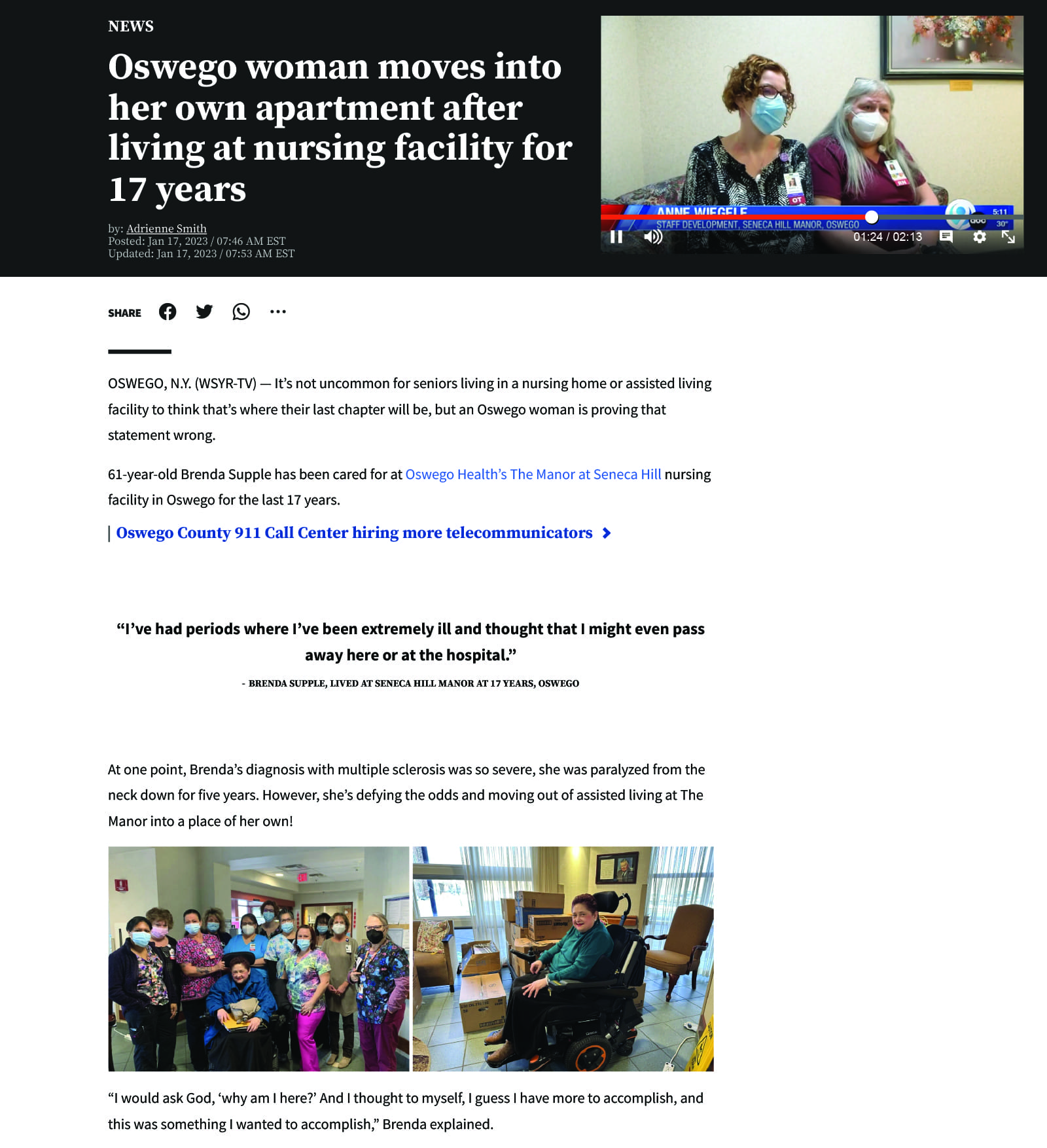 Oswego woman moves into her own apartment after living at nursing facility for 17 years (WSYR, January 16, 2023) DePaul > News > Oswego woman moves into her own apartment after living at nursing facility for 17 years (WSYR, January 16, 2023) Click here to view Click to share on Facebook (Opens in new window) Facebook Click to share on X (Opens in new window) X