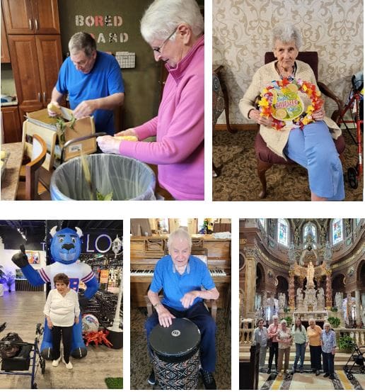 Pictured bottom row, left to right, Carmella Stanley enjoys an outing to The BFLO Store followed by lunch at Olive Garden; Dick Epps participates in a drum circle with KB Percussion Adventures, and Mary, Joyce Atwater, Virginia Perkins, Julie, Geri and Joan DiCarlo tour the Our Lady of Victory National Shrine & Basilica.