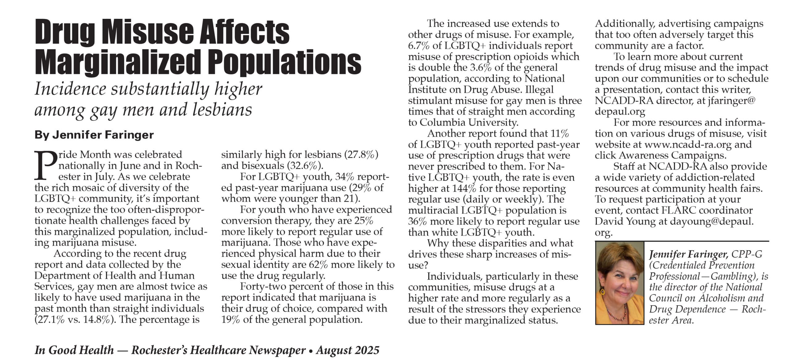 Drug Misuse Affects Marginalized Populations (In Good Health: August 2025) DePaul > News > Media Coverage > 2025 > Drug Misuse Affects Marginalized Populations (In Good Health: August 2025) Click here to view Click to share on Facebook (Opens in new window) Facebook Click to share on X (Opens in new window) X