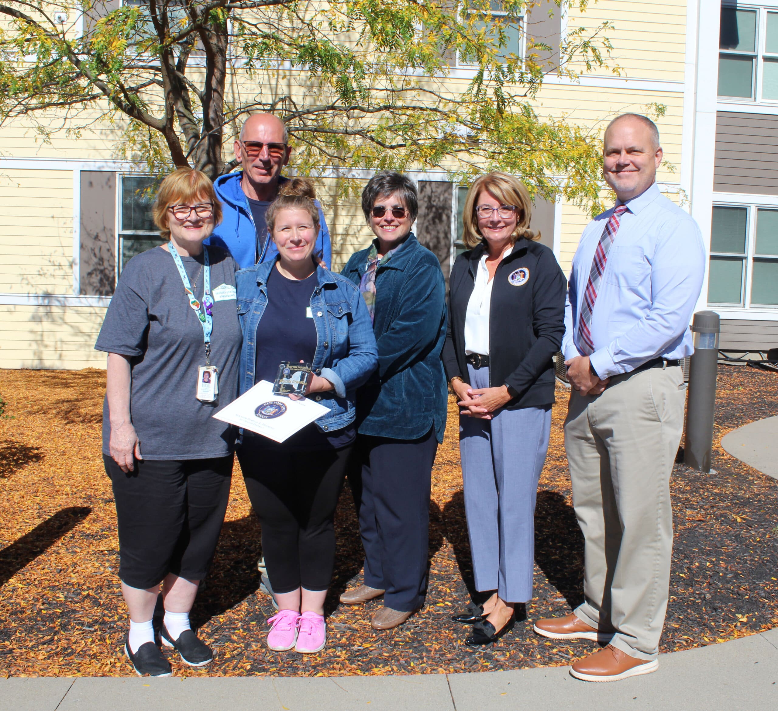 In addition, Senator Helming recognized Trolley Station Apartments Property Manager Melissa Dymond with a New York State Commendation Award for her quick-thinking and fast response to an emergency situation in which a resident required the Heimlich maneuver. Melissa’s decisive action helped ensure the resident’s safety. Melissa is pictured with Housing Specialist Elizabeth Wiatrowski, Maintenance Specialist Philip Durso, Vice President of DePaul Properties, Inc. Gillian Conde, Senator Helming and Canandaigua Town Supervisor Jared Simpson. We proudly commend Melissa for her heroic actions and commitment to our residents!
